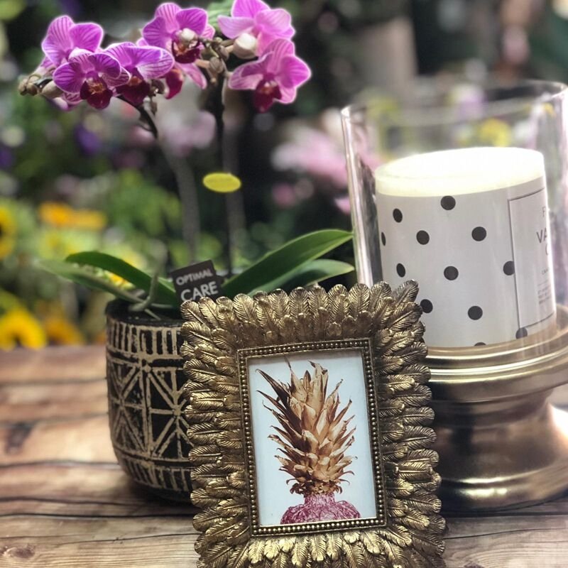 יערה במיוחד בשבילך: סחלב קטן בכלי אוריינטלי, מסגרת קטנה מוזהבת לתמונה ופמוט עם נר ריחני
