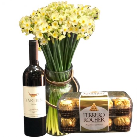 יערה זר נרקיסים גדול כולל שוקולד איכותי ויין
